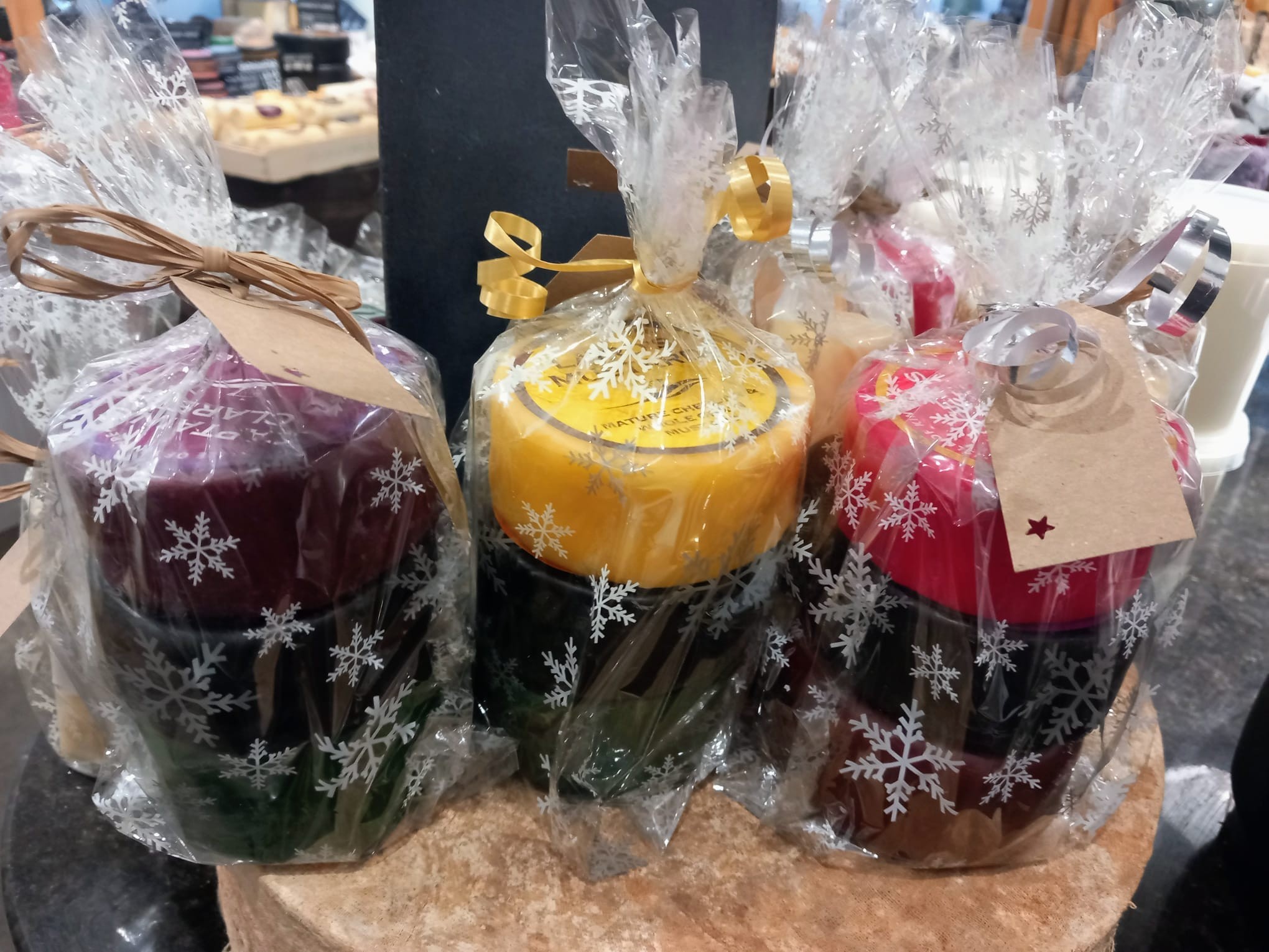 Trio of different waxed cheddar cheeses in festive packaging and tag for a personal message